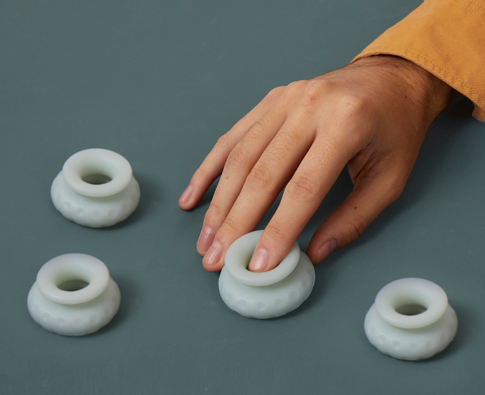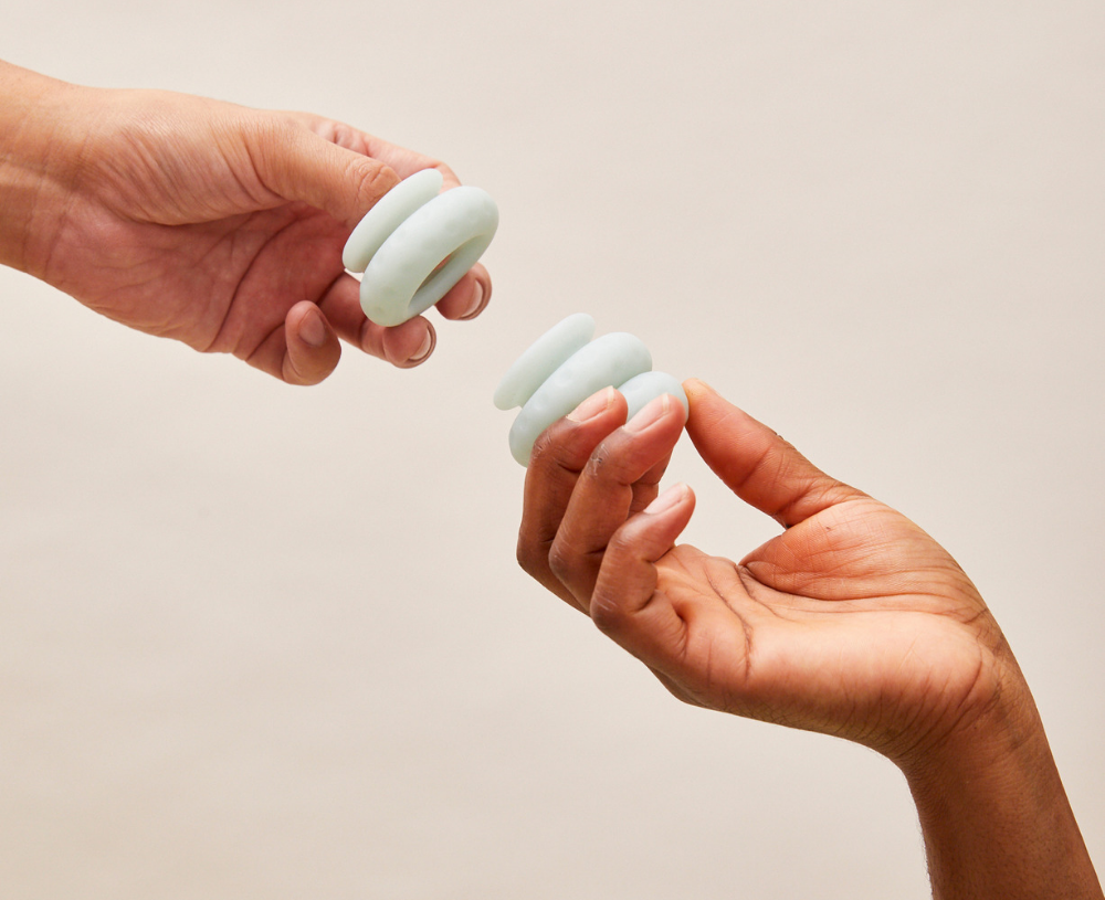 Worn externally at the base of a penetrating partner (e.g. on their shaft or on a toy), Ohnut compresses down to act as a soft buffer during sex. Each set comes with 4 linking rings that allow you to make simple adjustments, so you and your partner can not only discover comfort but also what depths feel really good—for both of you.